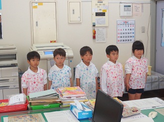 エプロンをして、「牛乳を取りに来ました。」の礼儀正しくしっかりとした口調で