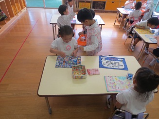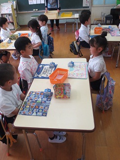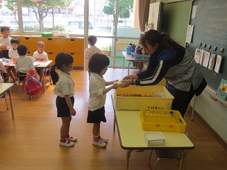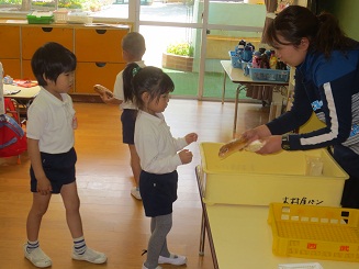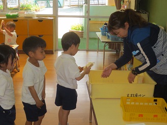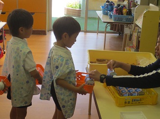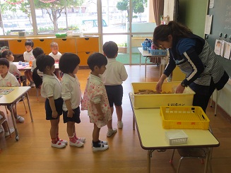 先生の合図で牛乳を配ったり、パンをもらったりと並びます。