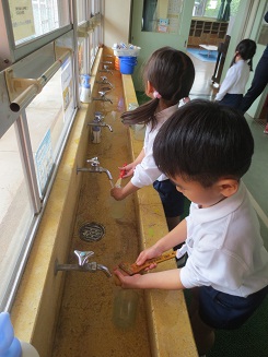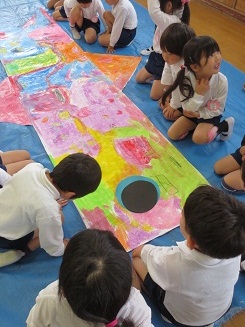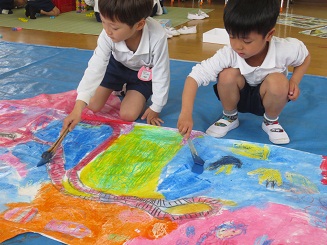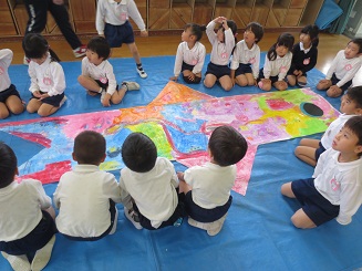 目というのは魂を表すもの。鯉が生き生きとしてきました。みんなの願いが生きていくような感じです。 昨年きりん組さんの時に作った鯉よりさらにおおきく格好よいです。これから五月の風を受けてもっともっと生き生きしてとび跳ねるでしょうね。筆洗いの片付けまでしっかり出来たさくら組さんでした。