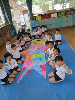 もうすぐこどもの日、さくら組さんたちが協力して作り上げた大きな鯉のぼり。それぞれに絵柄、色塗りが終わり、仕上げに大切な目が入りました。