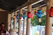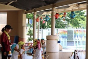 テラスには、園児たちが作ったかざりが風に揺れています。5歳児ばら組は、提灯を一人ひとり作成しました。4歳児ぱんだ組は、カラフルな金魚を作成しました。テラスのかざりを見ながら、明日を楽しみにしています。