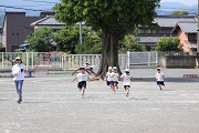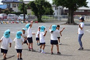 水くれの後は、園庭に出て、ダンスをしたり、砂遊びをしたりしています。暑いですが、みんな元気です。