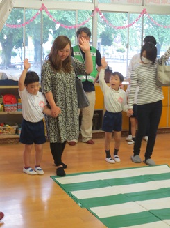 保護者と一緒に安全確認の一つ、横断歩道の渡り方を確認しました。