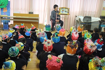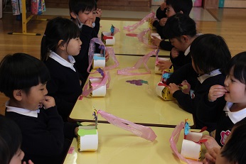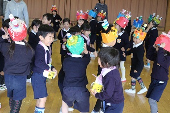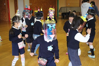 2月4日(月)、今日は立春です。「春」にふさわしい暖かな一日です。そして、春一番となるような暖かな強い風、一気に春がやってきたような日となりました。今日は幼稚園の節分行事「豆まき」を行いました。先生からは、「ふくちゃんはおうち」という紙芝居をプレゼント。そして、一人一人がつくった鬼の帽子やお面をつけて、鬼役をやったり、幸せをいのって豆をまいたりしました。楽しそうな声がホールに響きました。きりん組はきっと素敵な1年生に、そしてみんなに幸せな日々がくることでしょう。かわいい歓声を聞くと、笑顔いっぱいで走り回る姿をみると、心から大切な命がまもられて、みんな健やかに育ちますようにと祈らずにはいられません。