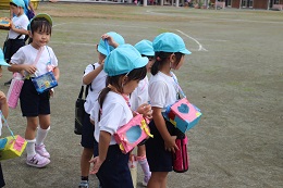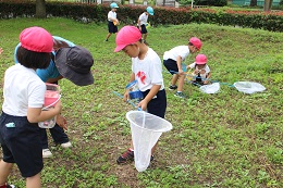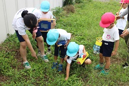 9月15日(木)は、朝から天気も大丈夫な様子。前から楽しみにしていたむしとりを決行しました。少し草に雨が残っていましたが、夢中で虫探しをしました。バッタやこおろぎ、とんぼと草のかげにいる生き物を発見しては、大騒ぎです。楽しい時間が過ぎました。また、行こうね!