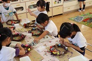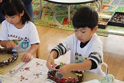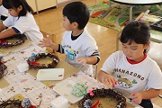 暖かい朝になりました。園児たちは、園庭に出て、好きな遊びで汗を流しました。その後、保育室に戻り、生活発表会の練習やクリスマス用のリースづくりをしました。