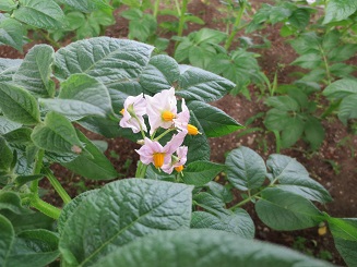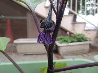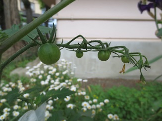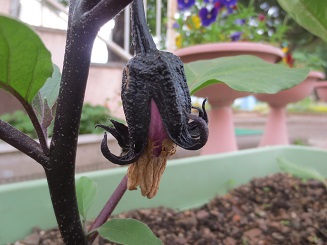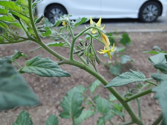 この前、さくら組さんが移植した野菜の苗たちが、おはよう、おはよう、とあいさつしてくれました。連休中に大きく育ち花や実をつけ初めての出会いです。