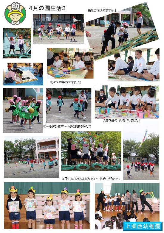 令和元年度 上柴西幼稚園 教育目標 ○あかるく ○やさしく ○たくましく ~ やる気いっぱい やさしさいっぱい 元気いっぱい ~ 園児数(令和2年7月1日現在) 4歳児(きりん組) 男11人 女 10人 計21人 5歳児(さくら組) 男10人 女10人 計20人 合計 男21人 女20人 計41人