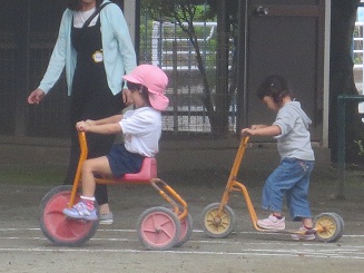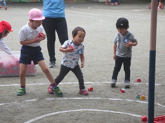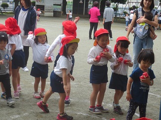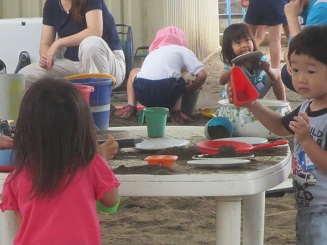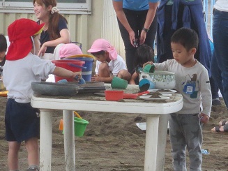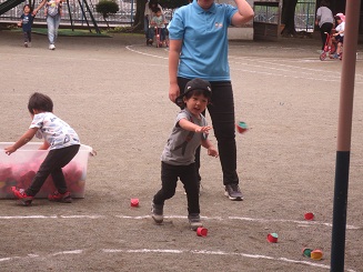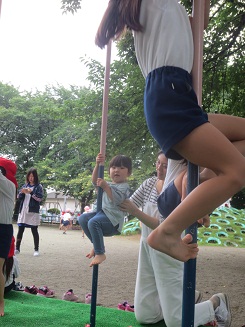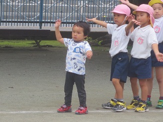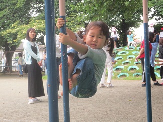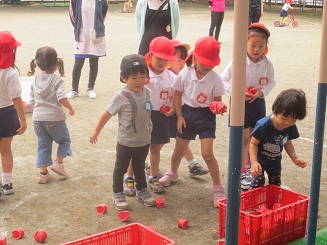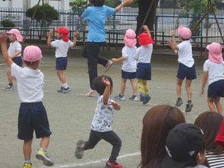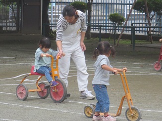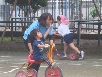 園児と一緒に遊びます。自分の遊びに互いに夢中ですが、時には、親切に小さい子たちに手を貸します。見よう見まねで踊りだす、音楽に合わせてなにかうきうき楽しいそう。