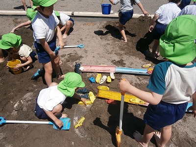 さくら組は、砂場で水遊びです。汚れた洋服のお洗濯よろしくお願いします。