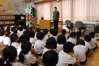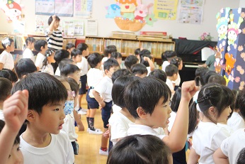9月2日(月)、長い夏休みが終わって、いよいよ2学期が始まりました。朝は、お母さんと離れるのが寂しかった様子の園児たちも、小ホールで始業式を行う頃には、シャキッとした顔つきで、背筋も伸びていました。全員が元気で夏を過ごせたこと、そして今日元気に登園できたこと、朝からご挨拶がしっかりできたことに「ありがとう」を伝えました。2学期はクリスマスまで続く長い学期です。たくさんの行事もあります。「苦手なことも泣かないで、歯をくいしばって努力する」ことをみんなで確認し合いました。夏休みに一回り大きくなった身体、2学期は一回り「こころ」が大きくたくましくなることでしょう。教育実習のお姉さん先生も来てくれました。保護者の皆さま、2学期もどうぞよろしくお願いいたします。