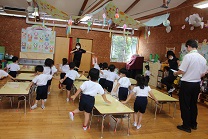 7月27日(月)は、県教育局北部教育事務所・深谷市教育委員会の先生方に幼稚園の保育について、ご指導をいただきました。朝の体操マラソンの様子から、それぞれのお部屋での活動を見ていただきました。4月、5月がお休みで、2か月間の幼稚園生活にも関わらず、入園したばかりとは思えないほどがんばっている3歳児クラス、人数が多いにも関わらず、落ち着いてしっかりと話の聞ける4歳児クラス、もう入学できそうなほどよい姿勢、楽しそうに製作に取り組む5歳児クラスなど、たくさんほめていただきました。