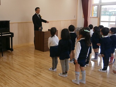 年長児は、始業式を行い、園長先生から、「みんなで、仲良く一年を過ごしましょう。」とお話をしていただきました。