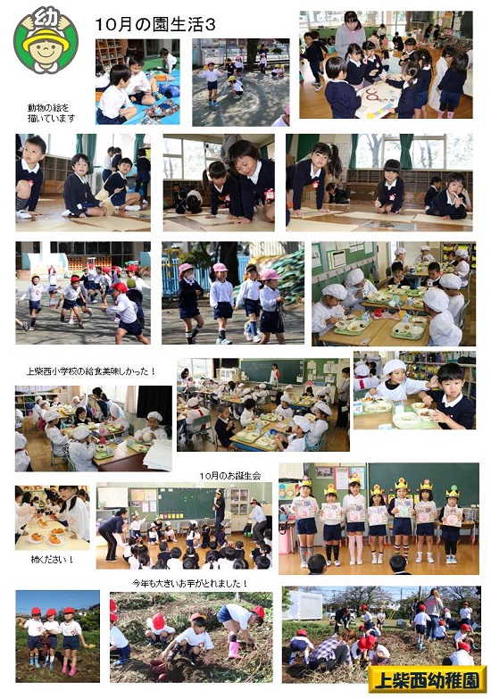 きょうから大晦日です。今年は皆さんに大変お世話になり、滞りなく教育の推進が出来ました。衷心より感謝申し上げます。今日も子どもたちは園での約束を守り、家庭で生活しています。この冬休みを利用して、二学期の活動を写真にまとめて紹介しています。今日はその7回目です。(10月分・上柴西小との交流会・サツマイモ掘り・誕生会等)