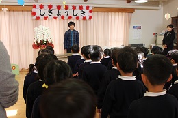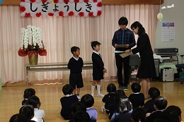 4月10日(月)、いよいよ1学期のスタートです。新しいお友だちを迎えて、きりん組33名になりました。まず、全員が事故なく、怪我なく、登園してくれたことに「ありがとう」を伝えました。そして、新入園のお友だちに園長から入園許可書を渡しました。園児たちは春休みを過ごして、体も大きくなり、40名の弟や妹を迎える年長さんとしての自覚も感じるほど、立派な態度でした。久しぶりにあった子どもたち、そして、久しぶりに園舎に響いたあいさつの声、おかべ幼稚園に活気が戻ってきました。