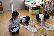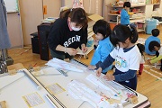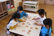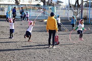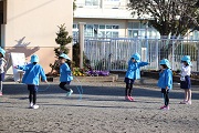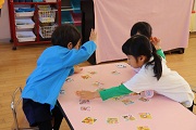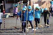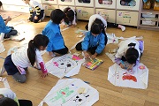 暖かい朝になりました。園児たちは、いつもの朝の活動を始めました。最初は、竹馬乗りと縄跳びです。縄跳びも竹馬乗りもみんな上手になってきています。ばら組の竹馬乗りは、今週から園庭にトラックを作って1周にチャレンジです。園庭での活動後は、ばら組は凧づくりの完成を目指します。ぱんだ組は、みんなでかるたとりです。一人ひとり、自分のするべきことをしっかりできるようになっています。