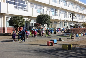 1月23日(水)、みらい幼児園おかべの5歳児クラス(ぞう組)と幼稚園の5歳児クラス(きりん組)が合同で、岡部西小学校へ学校探検にいってきました。46名の「あたらしい1年生」を小学校の1年生が迎えてくれました。天気予報によると3月並みの暖かさだそうですが、風のない、そして雲一つない良い天気でした。