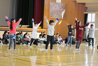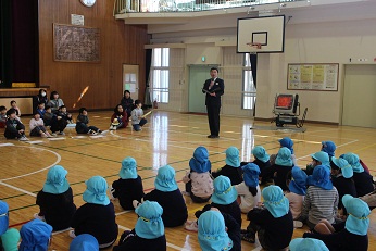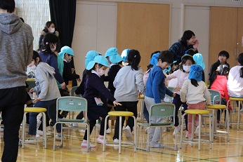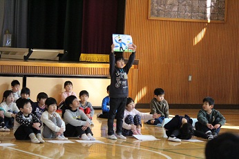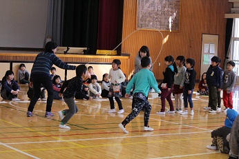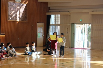 1年生が進行して、はじめの会をやったあと、校内を探検しました。そして、体育館で小学校の1年間を絵にして紹介していただきました。ダンスやなわとび、ピアニカの実演も見せてもらい、「もうすぐ1年生」の園児たちはあこがれのまなざしを向けていました。最後は各グループに分かれて、「おおあらし」といったらみんなが動く椅子取りゲームを楽しみました。校長先生からも「もうすぐ2年生」からも「待ってるよ」と声をかけていただき、園児たちは小学生になるんだなと実感したようです。小学校って楽しいな、お兄さんやお姉さんもやさしいな、ワクワクの気持ちをいっぱいにふくらませて、笑顔で小学校から帰りました。見えなくなるまで手をふってくれた「もうすぐ2年生」の皆さん、校長先生はじめ1年生の先生方、ありがとうございました。