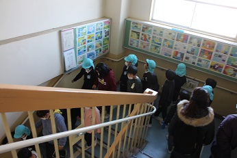 幼稚園にはない学校の階段です。飾られた作品にも興味津々。