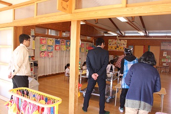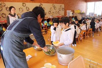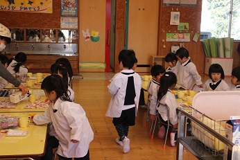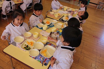 12月19日(火)は深谷市教育委員会教育総務課から3名の方々が給食の様子を見に来てくださいました。3歳児クラス(りす組)さんが給食着をきちんときて、お当番さんが配膳のお手伝いをしている様子をみて、感心していらっしゃいました。4歳児クラス(しか組)さんは支度が自分たちでどんどんできること、そしてどのクラスもしっかりと着席して食事をしている様子をほめていただきました。5歳児クラス(きりん組)さんだけでなく、3歳児クラスも、いただいた給食を完食できるほどになりました。おかわりだってたくさんします。試食していただいた給食もとてもおいしいという言葉を口々にいただきました。毎日温かくておいしい給食をいただけることにあらためて感謝です。