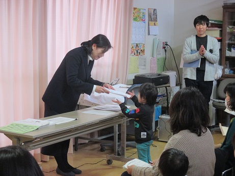 2月7日(木)は平成31年度の入園予定者のための入園許可交付式&入園説明会を行いました。一人一人教務の先生からお名前を呼ばれました。「はい」と元気にお返事をして、堂々と許可書を受け取ったお子様もいました。お家の方にだっこされて受け取った子もみんな4月からは、幼稚園に通います。入園説明会の間は、3歳児の保育室でみんなで遊びました。その後、現PTA会長さんと5歳児の副会長さんが中心になってくださり、次年度の役員決めを行いました。これで、PTA組織の案もできました。どうぞ、よろしくお願いいたします。