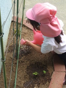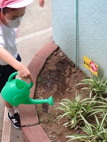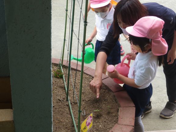 きりんさんが自分たちの種から芽がでたアサガオに水やりしましたよ。