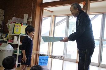 3月5日(月)は本年度 最後の「ボール投げ教室」でした。4月の計測と比較するためのソフトボール投げを行いました。体をほぐしてから、練習です。オレンジのテープをこえる高さで投げられるようにと意識して投げます。本番はソフトボールで投げました。結果は3人ほどが横ばいでしたが、90%の園児が投げる距離を延ばすことができました。ボール投げは新体力テストでも課題となる種目です。小学校に上がった時に、講師の増田先生に教わったことを思い出しながら記録を伸ばしてくれたらうれしいですね。最後なので、クラスのみんなから先生へ、自分たちの顔とメッセージの入った感謝状をお渡ししました。暑い日も寒い日もありました。本当にありがとうございました。