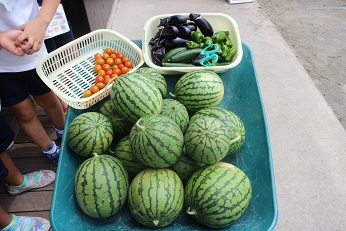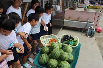 7月19日(木)は、終業式の前日です。37度を超える気温が続く中、今日はプール遊びも中止しました。保育室での制作や遊びが中心ですが、3歳児も自分たちのお部屋のお掃除をしていました。きれいにして、楽しく過ごしたお部屋に感謝する気持ちを育てることは大事な心育てです。5月に苗植えをして、園児たちが水やりや収穫をしてきた夏野菜も最後の収穫日です。みんなの気持ちに応えて、たくさんの実りを見せてくれました。園児全員に各野菜をもって帰ってもらうことができました。畑にも感謝です。明日は、今日収穫したスイカをみんなで味わいます。
