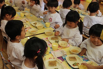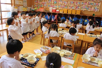 最初は、食べなれない食材やメニューもありましたが、今では3歳児のクラスも給食を完食するまでに成長しました。毎日毎日、給食を楽しみにしている園児たちです。暑い日が続く中、火を使って、お湯を沸かして、調理してくださる調理員さんたち、ありがとうございます。今日は、にんじゃこごはん、豆腐入り松風焼き、おくらとトマトのツナあえ、味噌汁でした。成長期を考えた献立です。今日もおいしくいただきました。