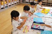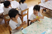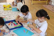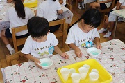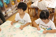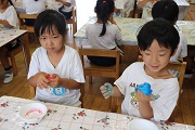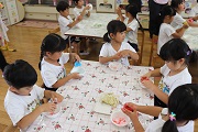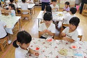 教育実習にきている学生の研究授業が行われました。授業としては、スライムを作って感触を確かめながら遊ぼうという内容でした。カラフルなスライムができ、園児たちも楽しそうにスライム作りや感触を楽しんでいました。今日学んだことをまた違うところで挑戦し、楽しんでくれるといいですね。4歳児ぱんだ組は、七夕かざりをつくりました。雨が続きますが楽しい七夕祭りができるといいですね。