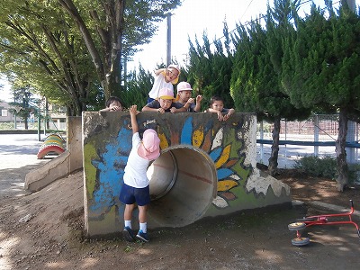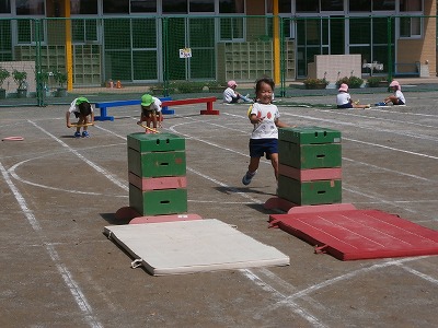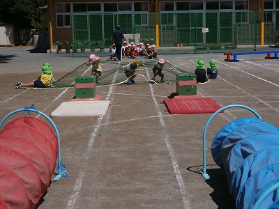 午前中は運動会の練習でした。とても暑かったですが、時より吹く風は、とてもさわやかでした。うさぎ組もさくら組も、障害物競走と、リズムの練習をしました。お互いの演技を見て、素直に歓声や拍手が沸き起こっていました。