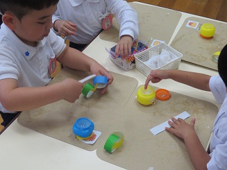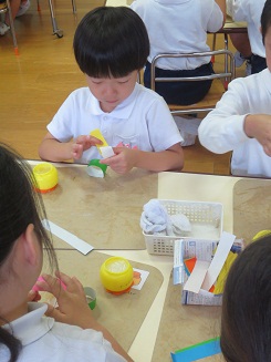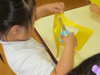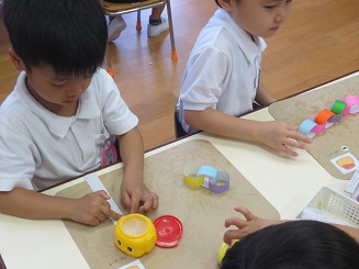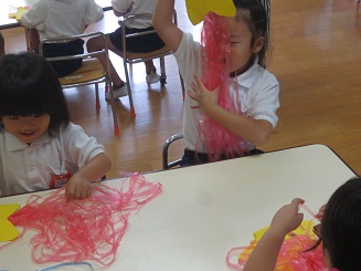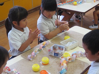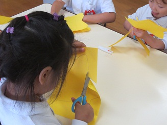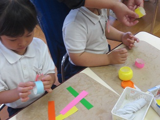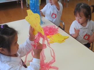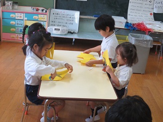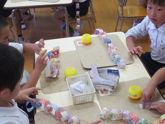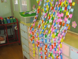 輪飾りを作っているのは、さくら組さん、一才の違いはその作る速さがちがいます。糊を使うのも輪に絡ませるのも経験がものを言います。さすが、わずかな時間にたくさんの輪飾りが出来上がりました。色の組み合わせにも個性を出して工夫がありました。友達と比べながら、先生に綺麗な色の組み合わせは紹介され、認められより自信となりましたね。ていねいに作りながらみんな楽しく作っています。