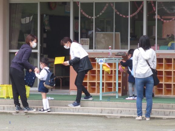 朝は先生とテラスで、検温確認カード、手の消毒、体調観察をして部屋へ入ります。