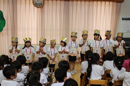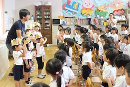 7月18日(火)は、7月と8月生まれのお誕生日会を行いました。3歳児(りす)組さんが3名、4歳児(しか)組さんが3名、5歳児(きりん)組さんが5名、お誕生の月となりました。先生から、お祝いのプレゼントをもらい、次は、みんなの質問コーナーです。大きくなったら、ケーキ屋さん、アイス屋さん、アイドルなど園児が大好きなものに関わる夢が多かったなか、お医者さんや看護師さん、警察官など、人のためにがんばってくださっている職業に自分のあこがれを抱いている5歳児もいました。社会に目が向いてきている成長ぶりに驚きます。自分も社会に役立つ人になりたいという5歳児の夢、大切に育てていきたいと思います。