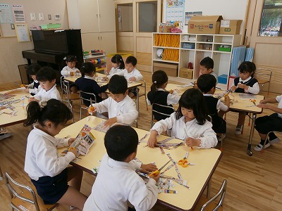 うさぎ組は、ハサミの練習です。下から上に向かって上手にハサミが使えたかな?紙を細長く切るのに、苦戦している姿も見られました。