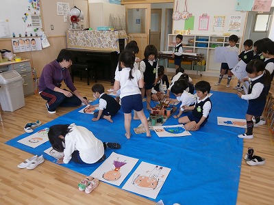 さくら組は、自分の顔をマジックで描き、絵の具で色を付けていきました。筆の使い方や、滲まないようにする方法など、子どもたちが考えて取り組む姿が見られました。