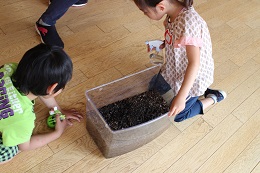 5月26日(木)の朝、ずっと世話をしてきたカブトムシの幼虫が幼児園のゾウ組さんで茶色くなったのが観察されました。幼稚園もりす組さんもしか組さんも楽しみにお世話をしてきたので飼育ガラスからのぞけるさなぎに大喜びでした。今日の体操マラソンは、昆虫太極拳という曲で、ダンゴムシになったり、カマキリになったり、自然観察、昆虫体操楽しみました。