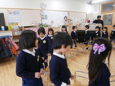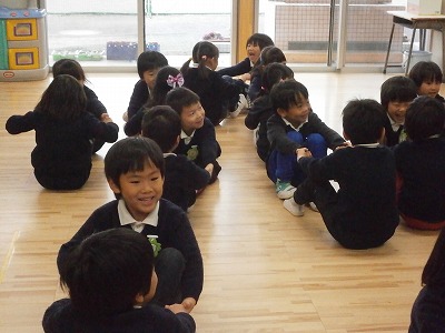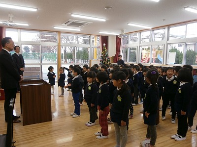 終業式を行いました。園長先生から、「早寝、早起き、朝ごはん。」「挨拶をしっかりしましょう。」と、2つのお約束をしていただきました。約束を守って、楽しい冬休みをお過ごしください。3学期も元気一杯の皆さんに会えることを楽しみにしています。