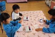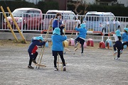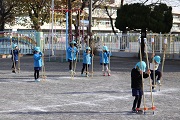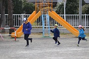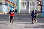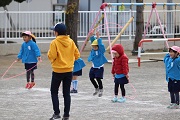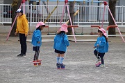 暖かな日差しがありますが、寒い、冷たい朝です。園児たちは、その中、園庭で鬼ごっこや竹馬のり、ぽっくりのり、縄跳びなどに取り組んでいます。みんな元気に活動しています。竹馬のりも上手になってきています。4歳児のぽっくりのりは、全員が乗れるようになりました。園児たちのバランス感覚はすばらしいですね。