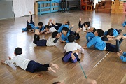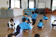 5歳児ばら組のみんなが、リズム室でリラックス体操をしていました。今日は、イルカになったり、かえるになったりして身体をほぐしていました。