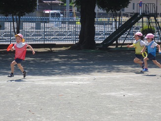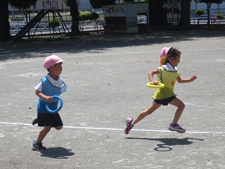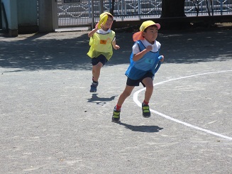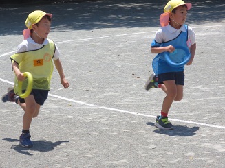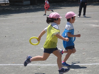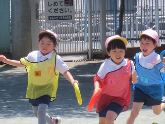 やりたかったのは、去年のさくら組さんのリレーをよく見ていてきっと格好良かったからでしょう、バトンタッチしたかったかな、ぬかすところしたかったかな、精一杯走るところかな、競争したかったかな・・・