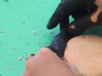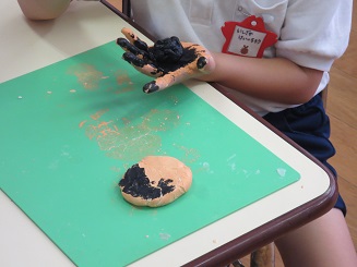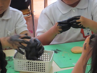 洋服を汚さないようにみんな父の髪を丁寧にこねて作っています。