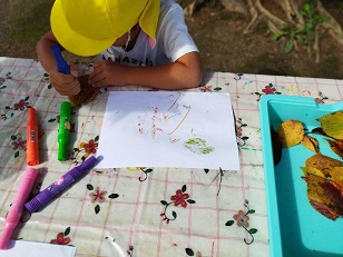 葉っぱの裏にマジックで色を付け、紙に模様を写し取りました。