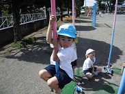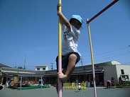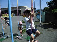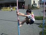 登り棒に挑戦、上手な園児は一番上まで登ってしまいます。また、登るとき、足の指を起用に使っています。この挑戦、遊びで身体の使い方を覚えていきます。