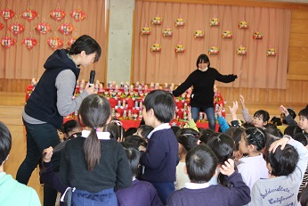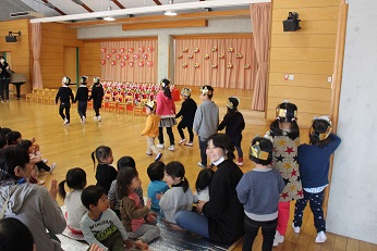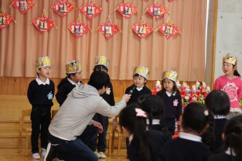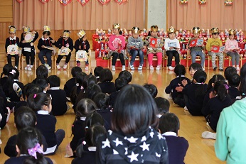 2月27日(火)は2月生まれのお友達の誕生日会を開きました。みらい幼児園おかべのお友達と一緒にお祝いします。みらい幼児園おかべのお友達のお雛様の作品がステージに飾られていて、とても春らしく華やかな感じでした。一人一人が将来への夢を語り、みんなから「がんばってね」、そして、「がんばります!」のお返事がやりとりされました。「お野菜を作る人になりたい」と答えたきりん組のお友達、ケーキ屋さんやサッカー選手、それぞれ夢を大きな声で発表しました。平成29年度もあとわずかとなりましたが、一人一人の園児の1年間の成長を感じました。みんなで元気に園歌い、先生たちからのプレゼントのジェスチャーゲームで盛り上がって、お誕生を祝いました。