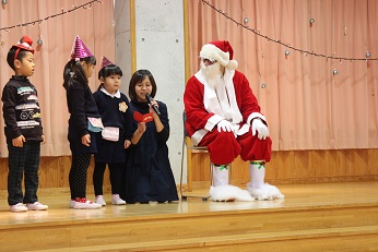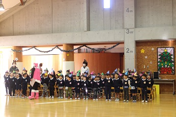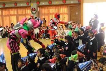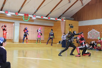 12月21日(木)はみらい幼児園おかべのお友達とおかべ幼稚園のお友達で合同のクリスマス会でした。園児たちは色とりどりの三角帽子をかぶり、「あわてんぼうのサンタクロース」を歌い、クリスマス会を開始しました。今日はサンタさんだけでなく、正義の味方のヒーローも園児たちの会に参加してくれました。園児たちは大喜びです。がんばった園児たちへの最高のプレゼントになりました。