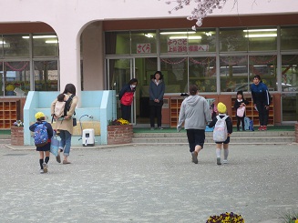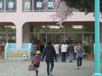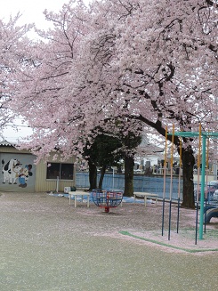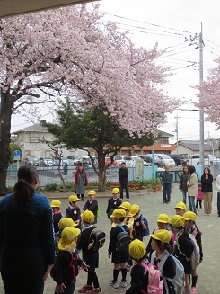 新出会いにワクワク学期スタートしました。さくら舞う中みんなが登園しました。昨日に比べて大いに寒い朝ですがあいさつもしっかりでき、元気スタートしました。