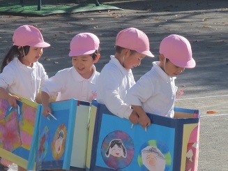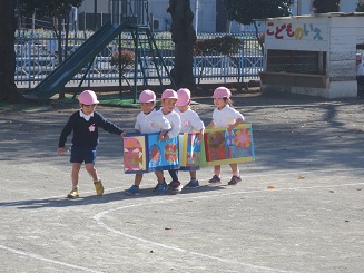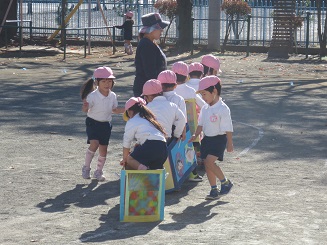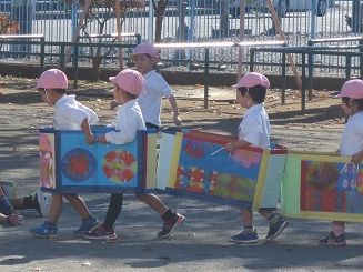 きりん組さんが晴れた日の昼、外遊びにて自分たちで作った色染めの電車で、電車ごっこをして遊んでいます。