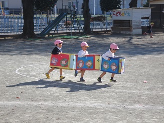 3両連結の電車、それぞれの車両(箱)に一人ずつ入り運転手さんが出発進行の合図で動きます・・・。