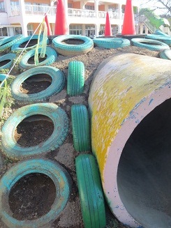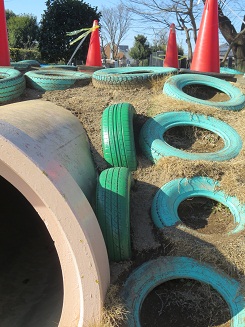 4カ所にタイヤを埋めて土砂を崩れにくくしました。その周りは芝生で固めました。芝生が根付くまで半年ぐらいはかかります。三角ポール内は入らないようにします。その他の場所は今まで通り上ってもよいと思います。